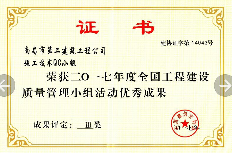 在中國(guó)建筑業(yè)協(xié)會(huì)組織的2017年度QC成果發(fā)布會(huì)上,公司QC小組的《提高GC發(fā)泡水泥保溫板外墻外保溫施工質(zhì)量》成果榮獲2017年度全國(guó)工程建設(shè)質(zhì)量管理小組活動(dòng)優(yōu)秀成果獎(jiǎng);付瑞平同志榮獲2017年度全國(guó)工程建設(shè)QC小組活動(dòng)優(yōu)秀推進(jìn)者稱(chēng)號(hào)。