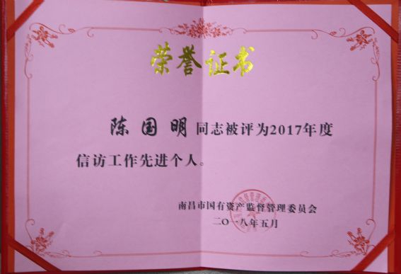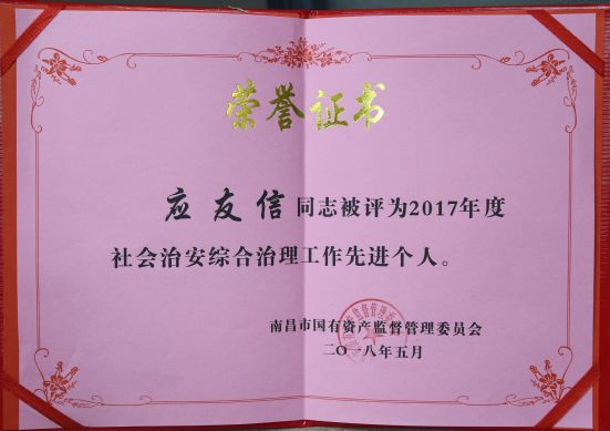 公司社會治安綜合治理和信訪工作榮獲國資委2017年度先進(jìn)單位,陳國明、應(yīng)友信同志榮獲國資委2017年度先進(jìn)個人稱號。