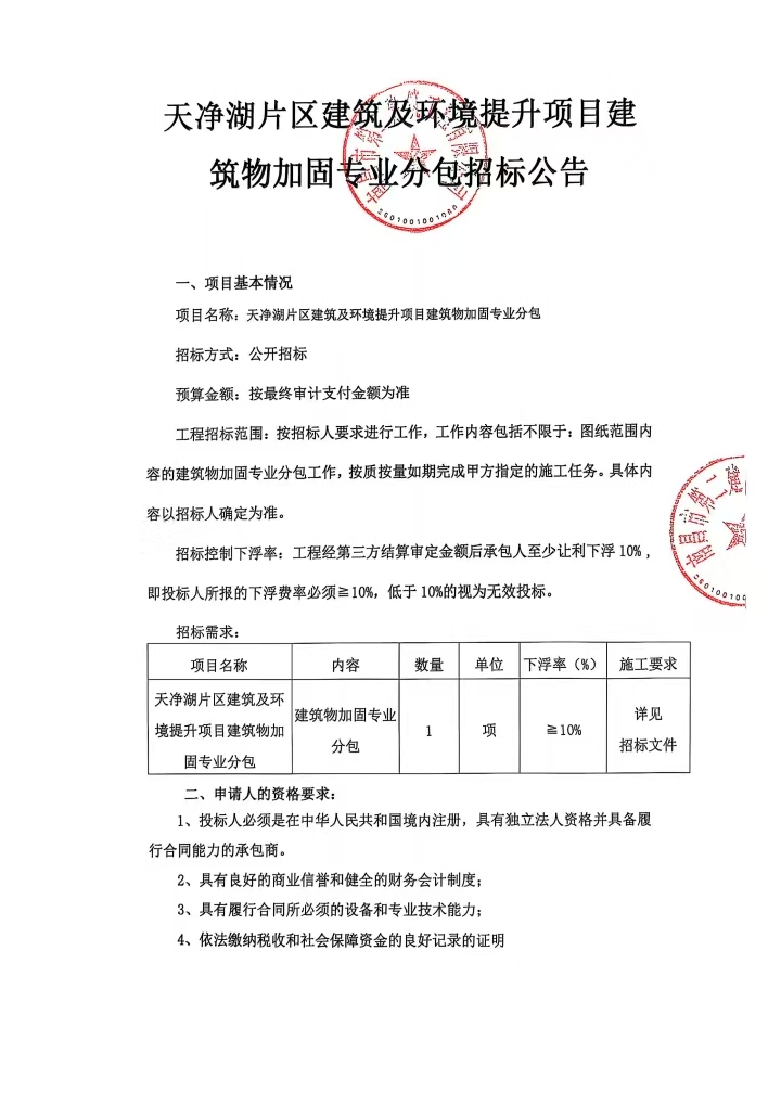 天凈湖片區(qū)建筑及環(huán)境提升項(xiàng)目建筑物加固專業(yè)分包招標(biāo)公告